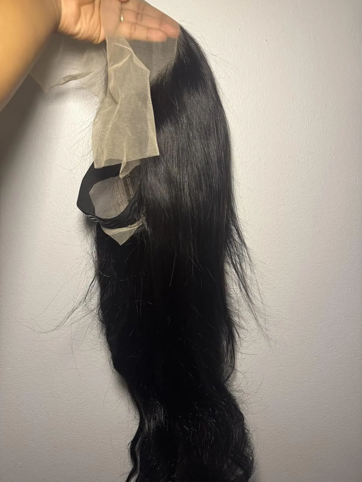 Bone straight HD lace frontal and closure wig. 100% Brazilian human hair, glueless, 360 full lace, natural melt, perfect for Black women.