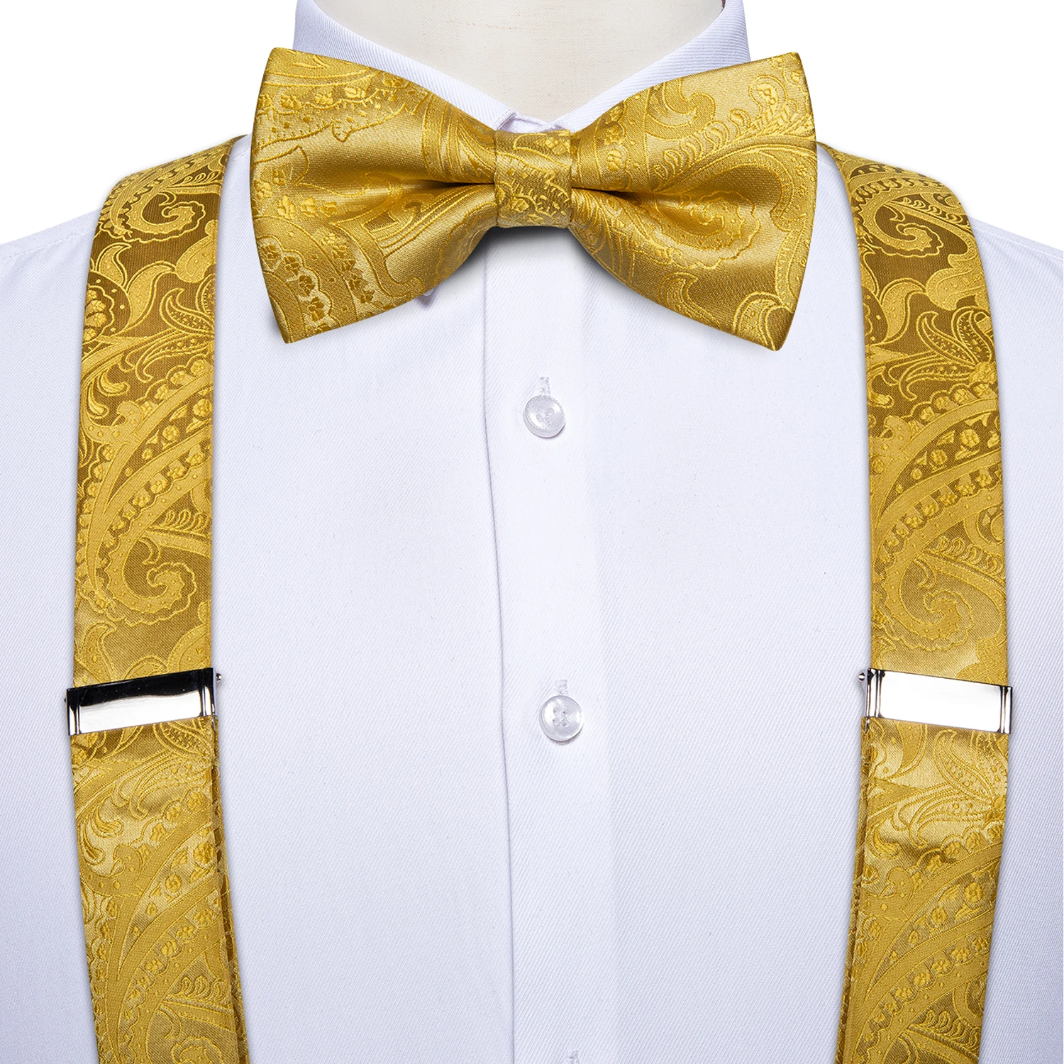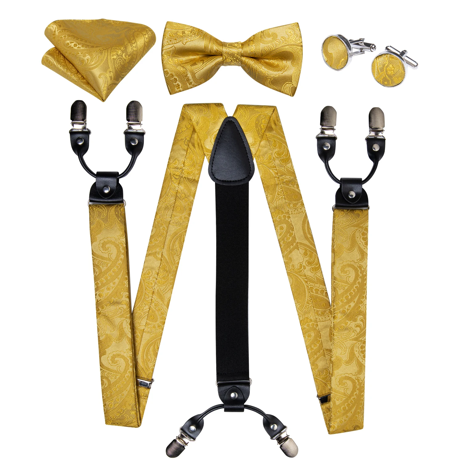 - Complete men’s formal accessory set: suspenders, bow tie, pocket square & cufflinks