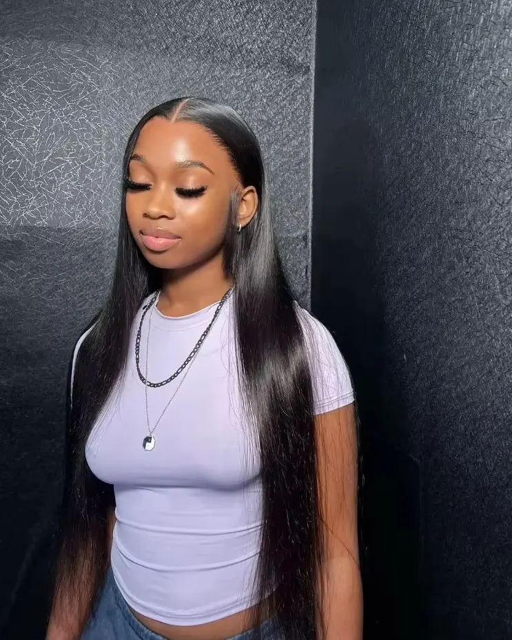 A sleek, bone-straight glueless human hair wig with pre-cut HD lace for fast, natural installs. Available in 4x4 and 5x5 closure options for a flawless, ready-to-wear look.